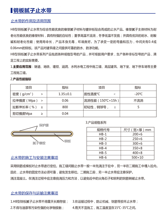 鋼板膩?zhàn)又顾畮е饕獞?yīng)用范圍:隧道、地鐵、堤壩、涵洞、水利水電工程中施工縫、高層建筑地下室、地下停車場(chǎng)等主要工程施工縫。