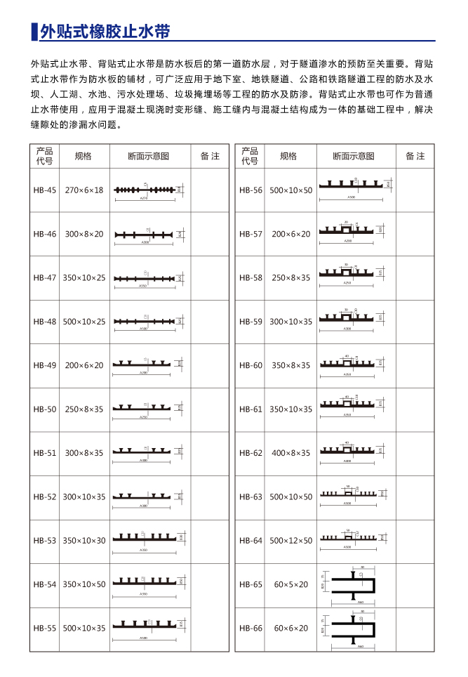 外貼式橡膠止水帶以天然橡膠與各種合成橡膠為主要原料,摻加各種助劑及填充料,經(jīng)塑煉、混煉、壓制成型,其品種規(guī)格較多,有橋型、山型、P型、U型、Z型、乙型、T型、H型、E型、Q型等。外貼式橡膠止水帶根據(jù)使用情況又可分類(lèi)為中埋式橡膠止水帶和外貼式橡膠止水帶。該止水材料具有良好的彈性,耐磨性、耐老化性和抗撕裂性能,適應(yīng)變形能力強(qiáng)、防水性能好,溫度使用范圍為-45℃-+60℃。當(dāng)溫度超過(guò)70℃,以及橡膠止水帶受強(qiáng)烈的氧化作用或受油類(lèi)等有機(jī)溶劑侵蝕時(shí),均不得使用橡膠止水帶。